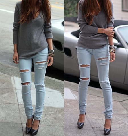 Mais do que clássico. Quando mais nova associava o jeans rasgado a aquelas pessoas com estilo roqueiro e tudo mais. Mas hoje em dia o jeans ripped (rasgado, em português) caiu no gosto de muitas mulheres. Há vários tipos de cortes que você pode fazer em sua calça. Se sua intenção é ousar, faça rasgos abertos em toda a calça, mas se quer dar um charme, um rasguinho é suficiente. Vamos primeiro para os ousados.